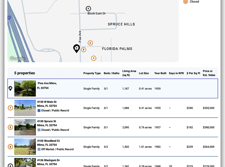 - 4130 W Main St, Mims — 3/1, 1,641 sf (1955) — Sold $305,000 (9/12/2025); updated interior finishes shown in listing photos