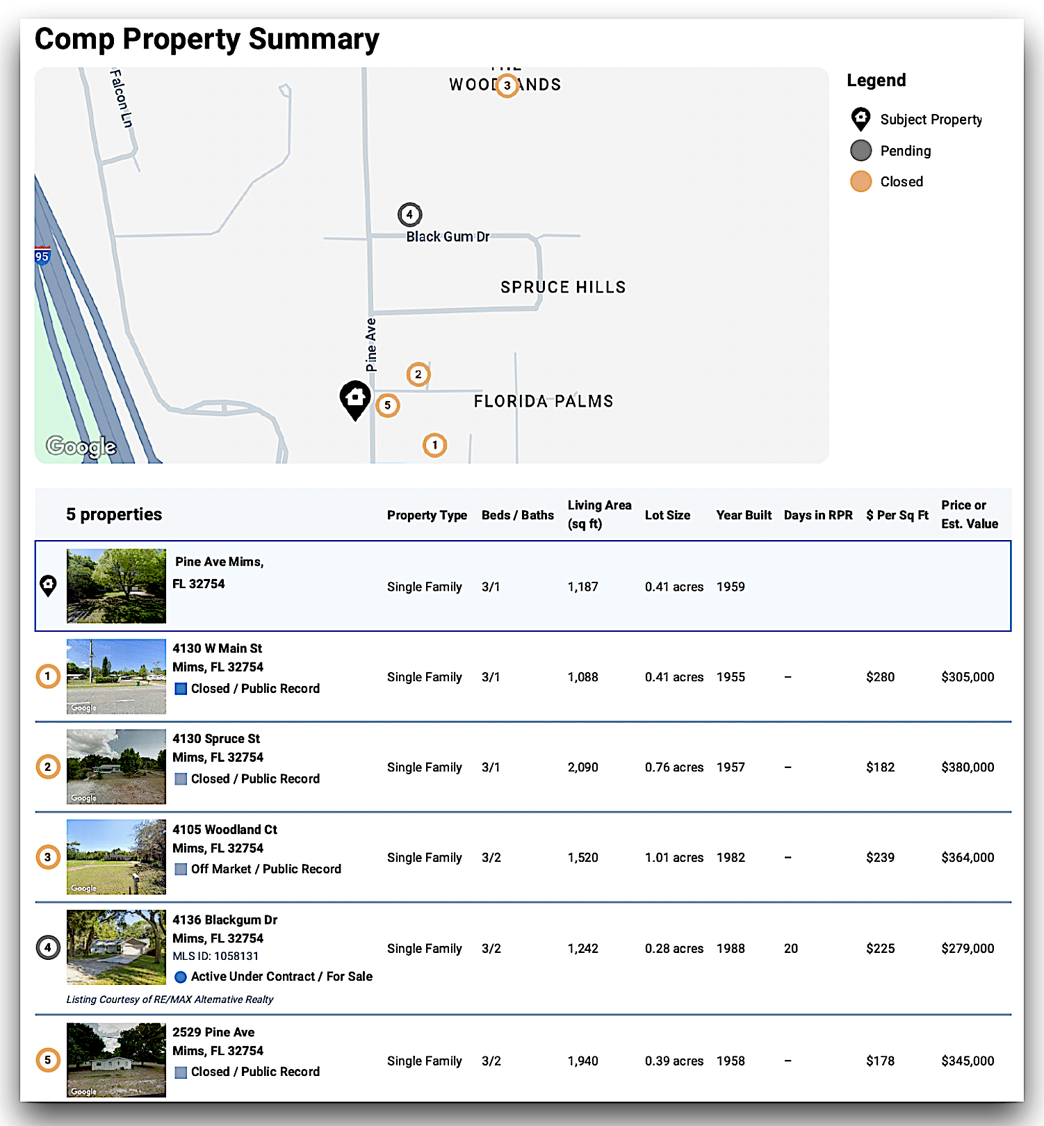- 2529 Pine Ave, Mims — 3/2, 1,940 sf (1958) — Sold $345,000; larger model on same street